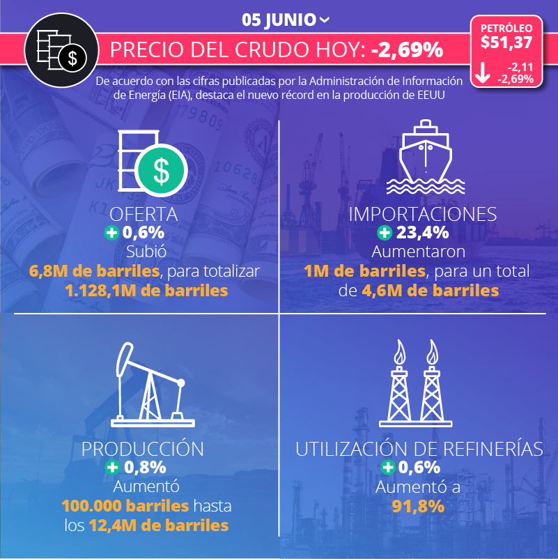 Al cierre de esta edición, el precio del barril bajó hasta $51,37, lo que representa –2,6% en comparación con el día martes.