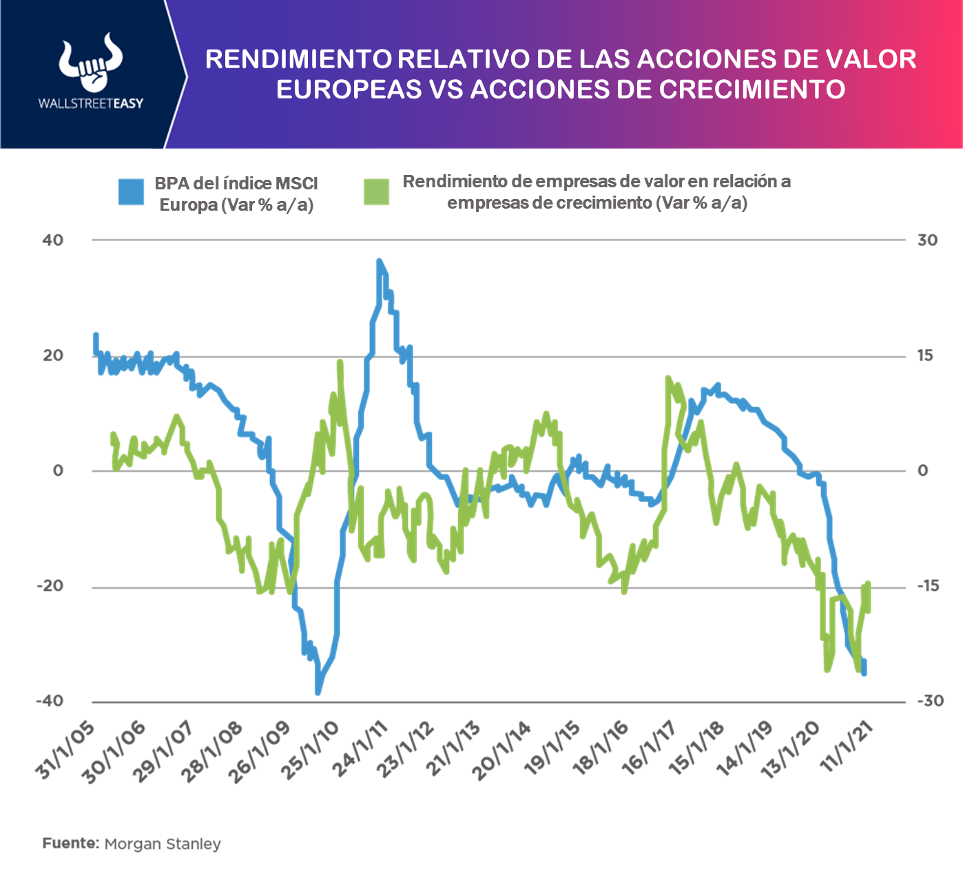 Los inversores han sido cautelosos durante mucho tiempo con las acciones de valor europeas. Sin embargo, ese sentimiento cambió a finales de 2020, cuando estas comenzaron a cerrar la brecha con sus pares de crecimiento. Es normal preguntar si este rally tiene poder de permanencia. Los estrategas de Morgan Stanley creen que sí, las principales razones son el fuerte crecimiento de los BPA, que tienden a corresponder con mejores rendimientos de las acciones de valor sobre las de crecimiento, entre otras variables.