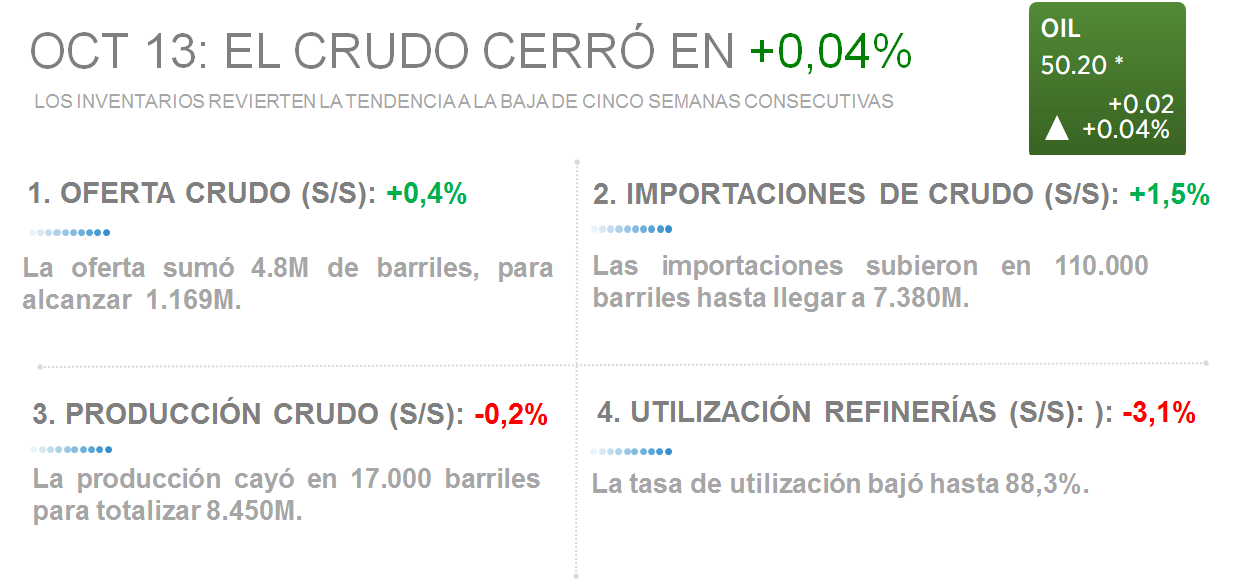 importaciones de crudo de China, en septiembre, de +18% interanual, el precio comenzó a superar los $50. Pero la noticia de más producción de la OPEP lo contuvo. El dato de inventarios hizo que retrocediera a $49,90, pero una lectura racional por menos gasolina se impuso.