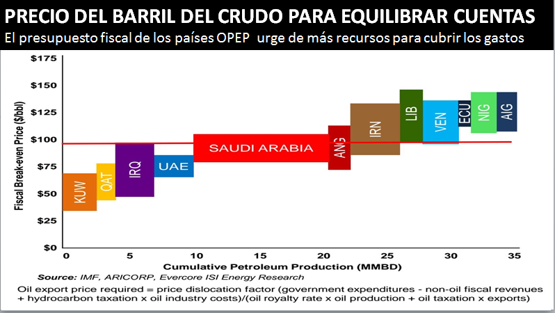 Los países OPEP han comenzado a sentir las consecuencias de bajos precios petroleros en sus presupuestos y naciones como Arabia Saudita tienen en la mira la emisión de títulos. El valor óptimo para cuadrar las cuentas varía de un país a otro. (Ver gráfica).