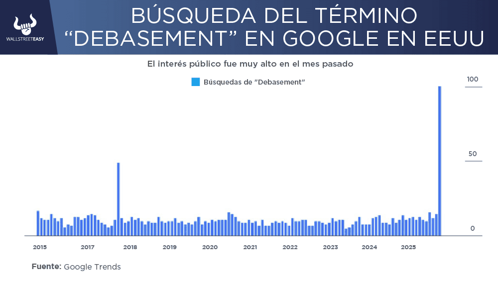 DAME CONTEXTO Si bien un movimiento tan brusco exige cautela, es fundamental enmarcarlo. A pesar de esta liquidación, el oro ha tenido un desempeño fenomenal en lo que va de 2025, superando cómodamente a índices clave como el S&P 500 y activos alternativos como Bitcoin. ¿ENTONCES? La fuerza impulsora detrás del impresionante rally de este año ha sido la poderosa narrativa de la "degradación" o "debilitamiento" (debasement) del dólar. Esta tesis se basa en el temor generalizado a que la política monetaria laxa y la inflación minen el valor intrínseco del dólar y otras monedas fiduciarias. La narrativa ha calado profundamente, como lo demuestran los picos de menciones en la cobertura mediática y las búsquedas en línea.