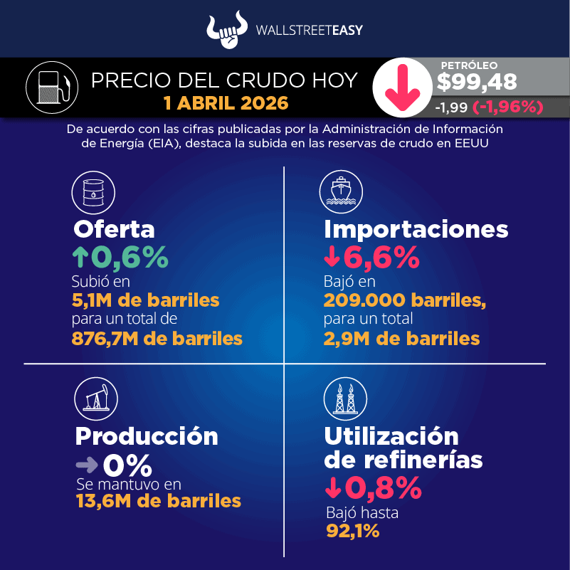 EIA, por sus siglas en inglés) reportó 876,7M de barriles en existencias de crudo, tanto comerciales como estratégicas, lo que representa un aumento de 5,1M de barriles. El Instituto Americano del Petróleo (