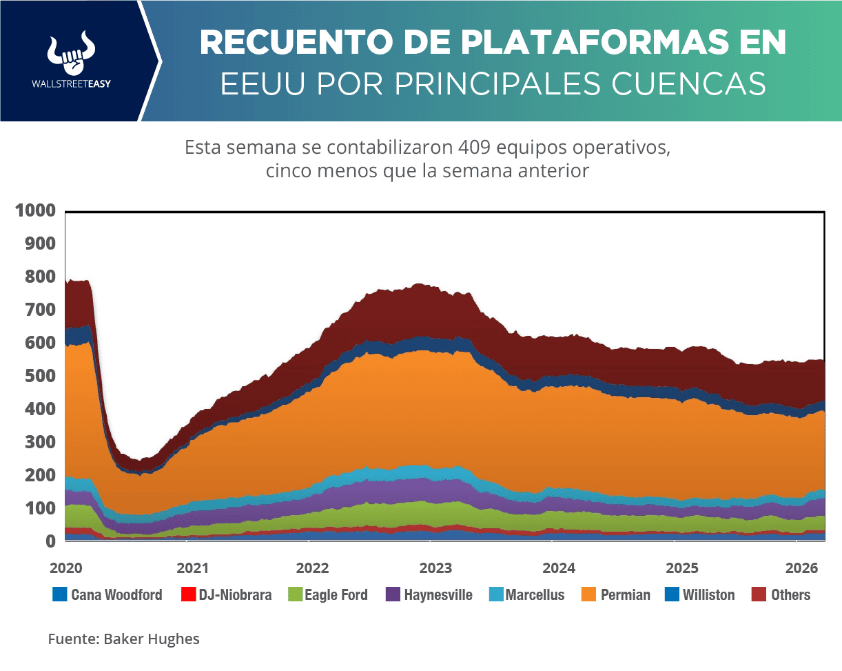 Baker Hughes, actualmente en EEUU se encuentran 543 equipos activos (incluyendo los de gas). En la actividad petrolera se contabilizaron 409, cinco menos que la semana anterior. En las operaciones de gas hay 127 equipos operativos, cuatro menos que hace siete días. Hace un año estaban activas 592 plataformas.