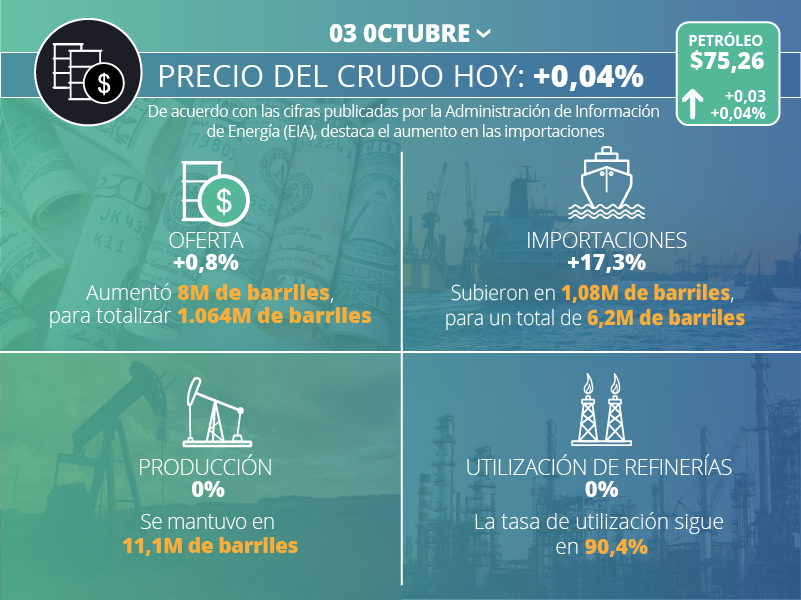 La Administración de Información de Energía (EIA, por sus siglas en inglés) reportó 1.064M de barriles en existencias de crudo, tanto comerciales como estratégicas, lo que representa un incremento de 8M de barriles. El Instituto Americano del Petróleo (API, por sus siglas en inglés) había estimado un aumento de 907.000 barriles. A continuación otros datos del informe: