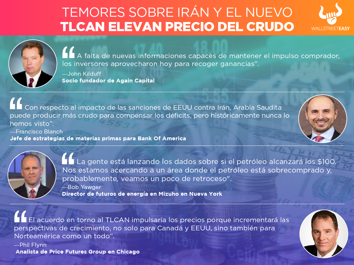 El crudo continúa al alza a medida que más petróleo iraní sale del mercado, lo que aumentó los temores de una crisis de suministro. Esta tendencia se vio fortalecida por la aprobación del nuevo TLCAN, ya que el tratado podría generar más demanda de energía si el consumo en México, Canadá y EEUU se mantiene estable. Nuevo rango esperado de precios es de $71-$76.