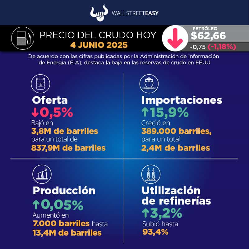Al cierre de esta edición, el precio del barril subió hasta $62,66, lo que representa -1,18% en comparación con el día martes.