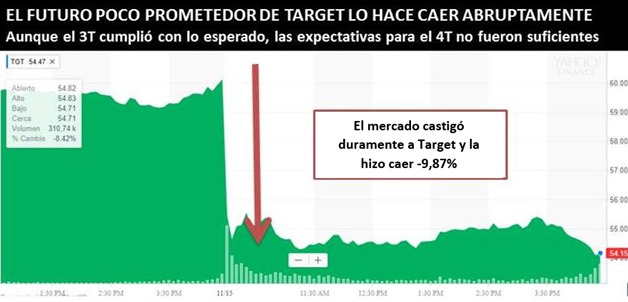Al mercado no le gustó para nada los números proyectados para el periodo vacacional. Target espera ganancias ajustadas por acción entre $1,05 y $1,25, lo cual aún está dentro del consenso de $1,24, aunque no lo suficientes.
