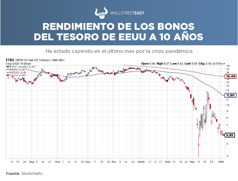 El pasado 9 de marzo, el rendimiento de los bonos del tesoro tocó su valor mínimo ante el fuerte desplome del mercado accionario, lo que pareciera tener un comportamiento similar a la crisis financiera del 2008 y la burbuja dotcom del 2000, cuando la bolsa colapsó por recesiones económicas y los bonos subieron por ser instrumentos de seguridad.
