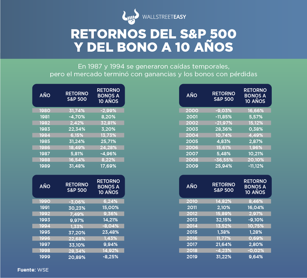 En 1987 se produjo el llamado Lunes Negro en 1987, y en 1994, el avance de un mercado especulativo aunado a las expectativas por una subida de las tasas de interés generaron un desplome temporal en los mercados. En ambos casos, luego se produjo una recuperación para cerrar el año con ganancias de +5,81% en 1987, y +1,33% en 1994, mientras que los bonos terminaron con pérdidas.
