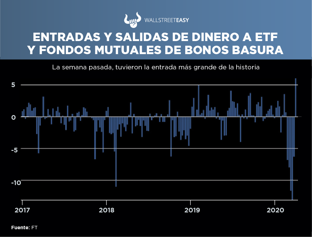 Los fondos mutuales y los ETF en bolsa que invierten en bonos basura tuvieron ingresos de $7.000M, la suma semanal más grande de la historia, lo que puso fin a una serie de salidas de cinco semanas. Las entradas fueron lideradas por un flujo récord de $5.900M, según datos de EPFR Global.