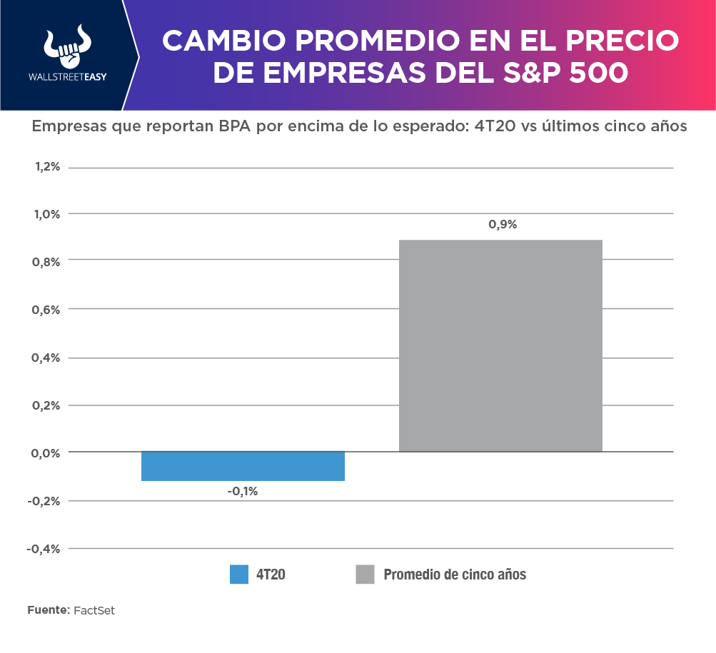 Las empresas que han reportado sorpresas de ganancias positivas para el 4T20 han visto una caída en el precio de 0,1% en promedio, tomando en consideración los dos días antes de la publicación de ganancias y los dos días después de la publicación. Esta disminución porcentual está muy por debajo del promedio de cinco años que ha arrojado un crecimiento de +0,9%.