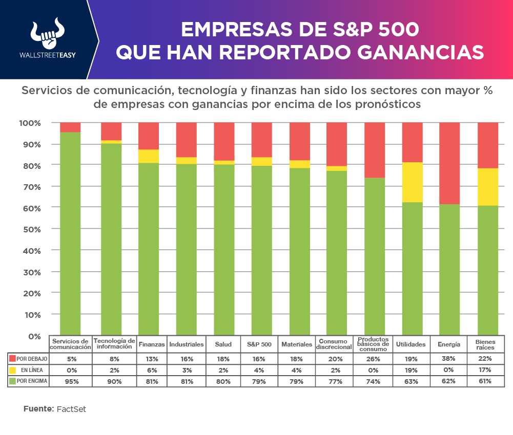 Dicho 79% se ubica por encima del promedio de cinco años de 74%, y si ese es el número final una vez que todas las empresas hayan reportado, sería el tercer porcentaje más alto de compañías del S&P 500 que reportan una sorpresa de BPA positiva desde que FactSet comenzó a rastrear la métrica en 2008.