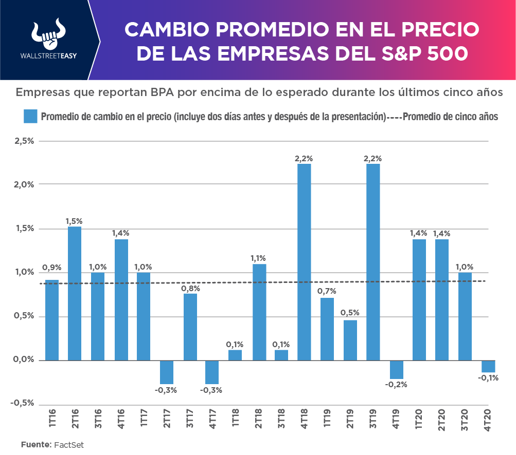Si el porcentaje final para el trimestre es 0,1%, sería la primera vez que el índice haya experimentado una disminución promedio en el precio para las empresas del S&P 500 que reportan sorpresas de EPS positivas desde el 4T19.
