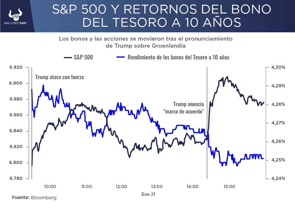 Lo que sí capturó la atención de los inversores fue el "riesgo de cola" relacionado con una posible acción militar o económica contra Dinamarca. La volatilidad se redujo drásticamente cuando Trump sustituyó la amenaza de fuerza y aranceles por la existencia de un "marco de acuerdo". Esta maniobra fue suficiente para que el S&P 500 recuperara sus pérdidas y los rendimientos de los bonos a diez años se estabilizaran.
