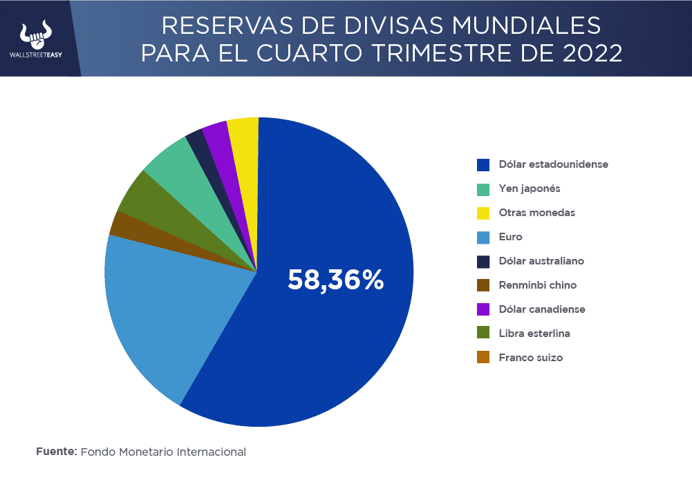 El dólar es ampliamente visto como una reserva de valor confiable, en gran parte debido a la estabilidad en relación con otras monedas, el dólar representa casi el 60% de las reservas de divisas. El euro es la segunda moneda de reserva más grande del mundo, pero ocupa un distante segundo lugar, ya que representa el 21%.