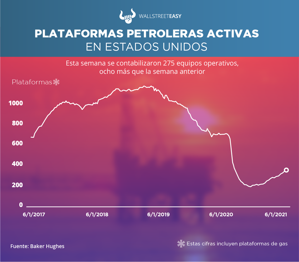 De acuerdo con información de Baker Hughes, actualmente en EEUU se encuentran 360 equipos activos (incluyendo los de gas). En la actividad petrolera se contabilizaron 275, ocho más que la semana anterior. En las operaciones de gas hay 84 equipos operativos, uno más que hace siete días. Hace un año estaban activas 805 plataformas.