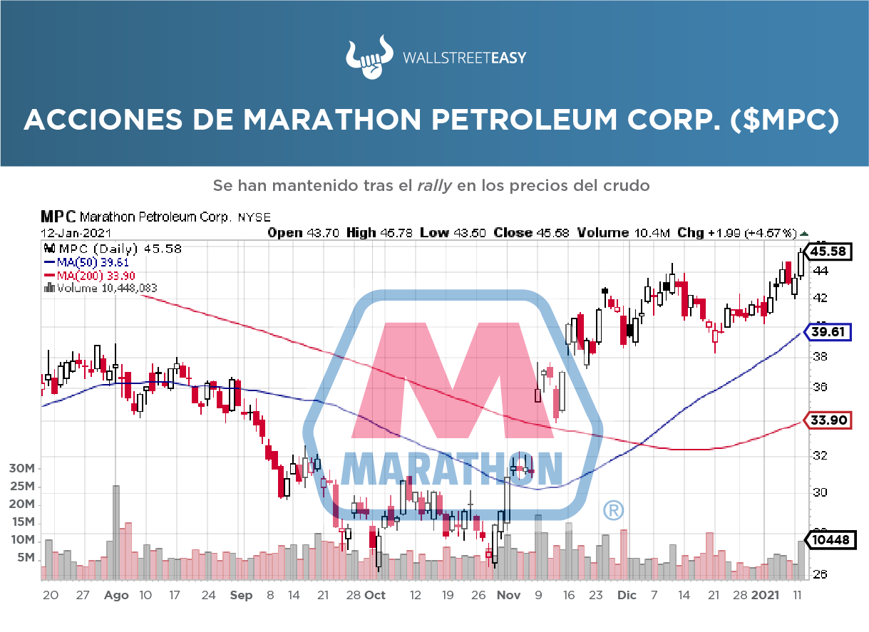 Las tres grandes refinerías, Marathon Petroleum, Valero y Phillips 66, bajaron un promedio de –32,3% en 2020, en comparación con el año anterior. De ellas, Marathon fue la que mejor se desempeñó con una pérdida del –27,4%.