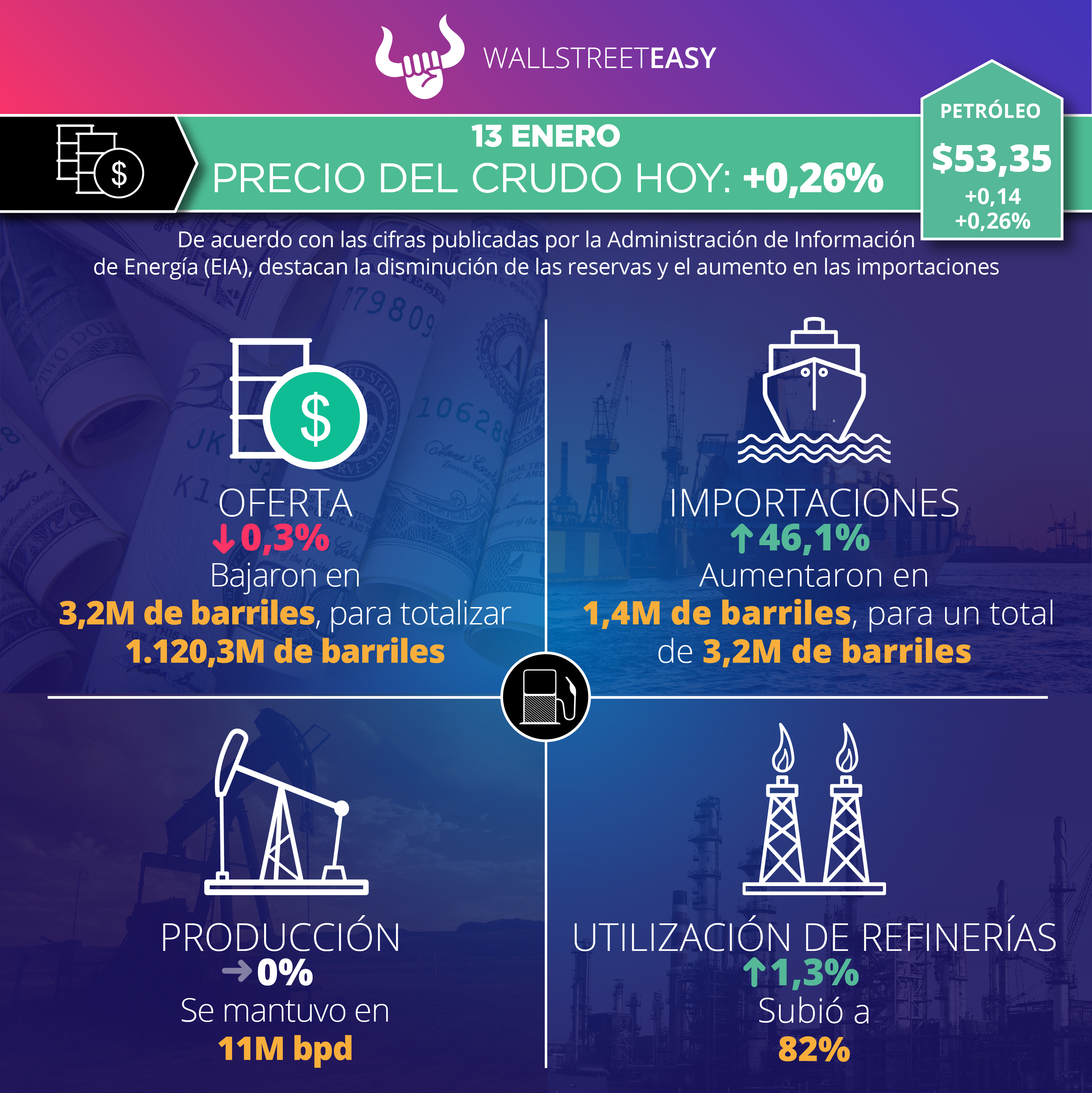 Al cierre de esta edición, el precio del barril bajó hasta $53,35, lo que representa +0,26% en comparación con el día martes.