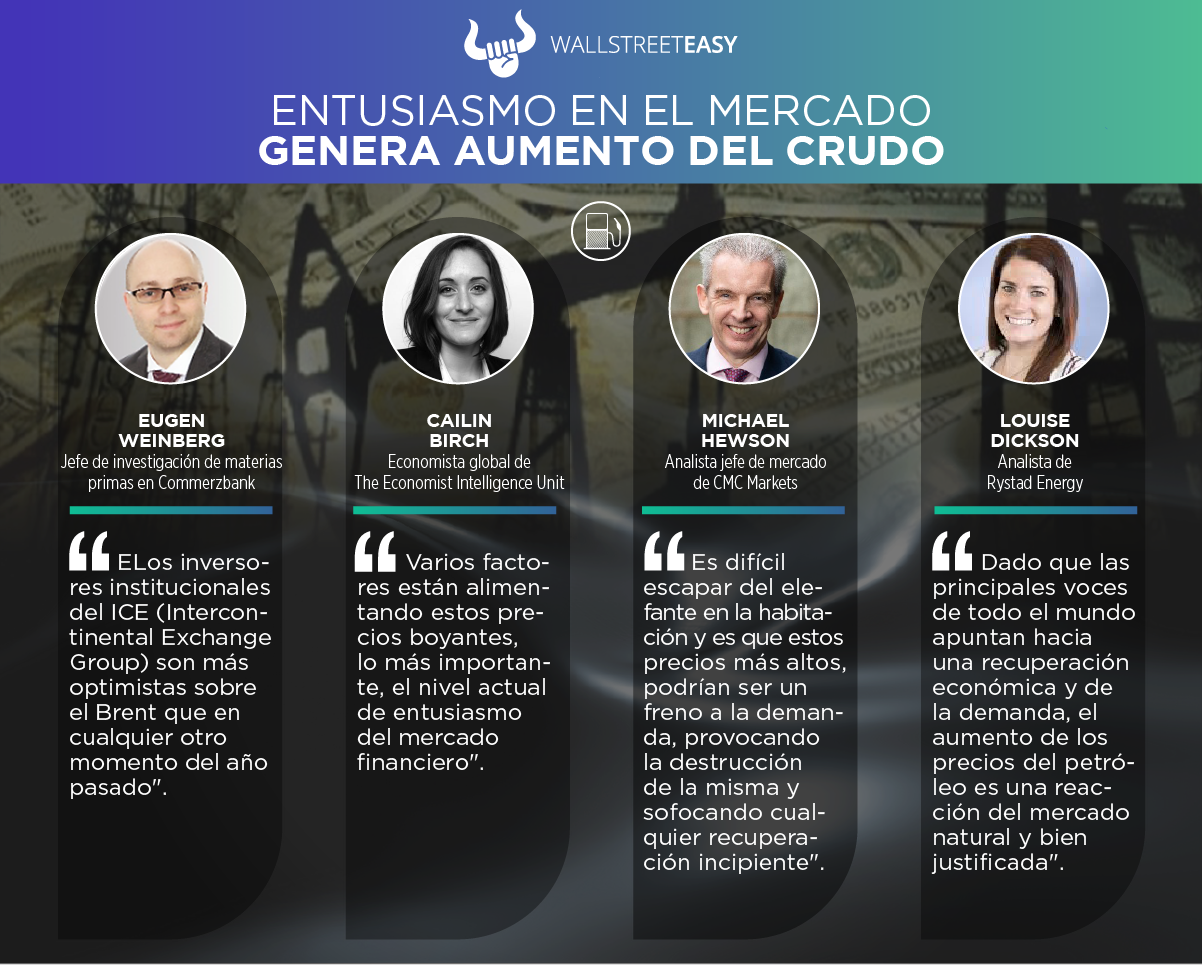 Los precios del crudo se encuentran al alza, debido al nivel de entusiasmo que existe actualmente en el mercado, junto a la posibilidad de que la administración Biden apruebe un segundo gran proyecto de ley de ayuda económica, y la reciente y robusta actividad económica en China. Los analistas creen que a corto plazo precios más altos podrían frenar la demanda, pero las esperanzas sobre el ritmo de la recuperación económica en 2021 son elevadas. Nuevo rango esperado es de $53 – $59.