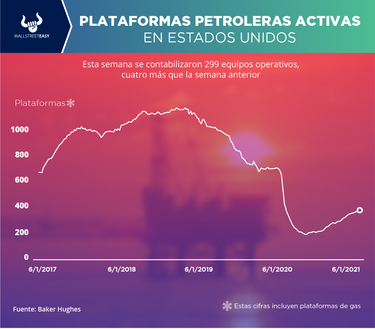 De acuerdo con información de Baker Hughes, actualmente en EEUU se encuentran 392 equipos activos (incluyendo los de gas). En la actividad petrolera se contabilizaron 299, cuatro más que la semana anterior. En las operaciones de gas hay 92 equipos operativos, cuatro más que hace siete días. Hace un año estaban activas 790 plataformas.