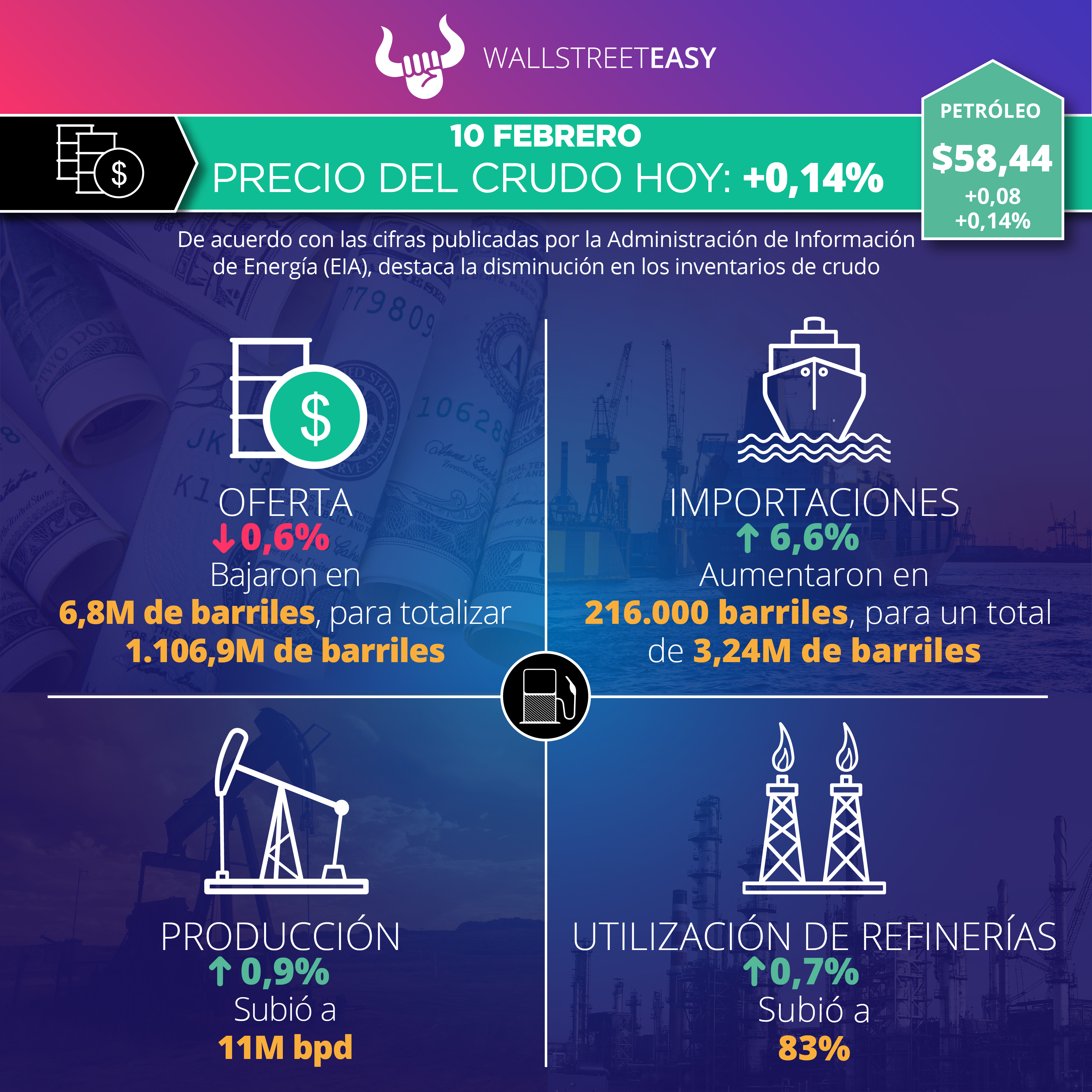 Al cierre de esta edición, el precio del barril subió hasta $58,44, lo que representa +0,14% en comparación con el día martes.