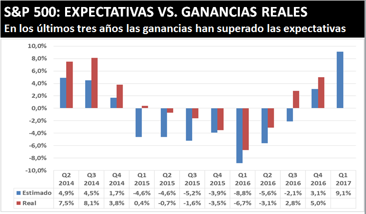 El crecimiento promedio de las ganancias por trimestre para el S&P 500 ha sido +2,9% más alto que la cifra esperada. De acuerdo con este antecedente, al estimarse en +9,1%, la tasa real podría alcanzar +12%.