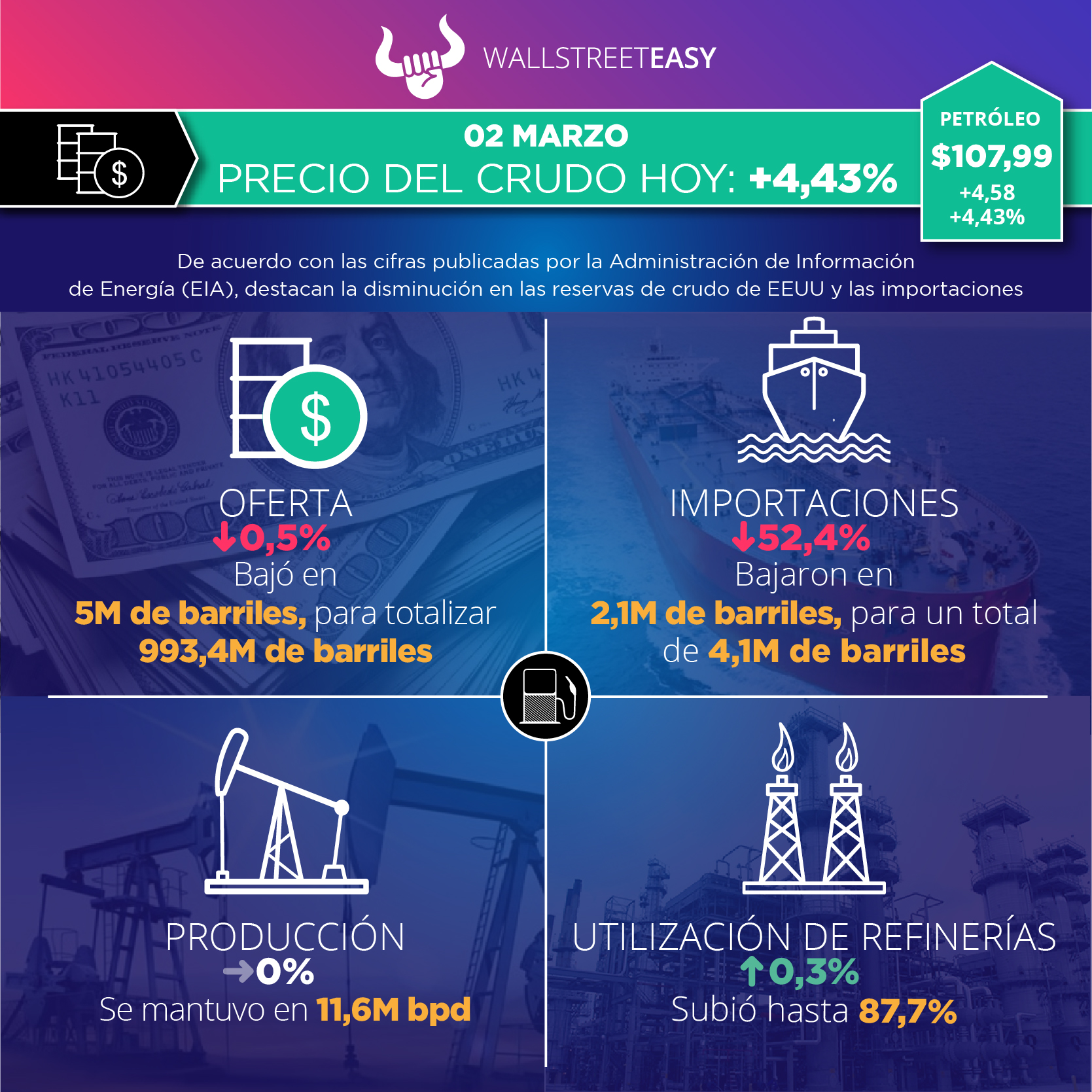 Al cierre de esta edición, el precio del barril subió hasta $107,99, lo que representa +4,43% en comparación con el día martes.