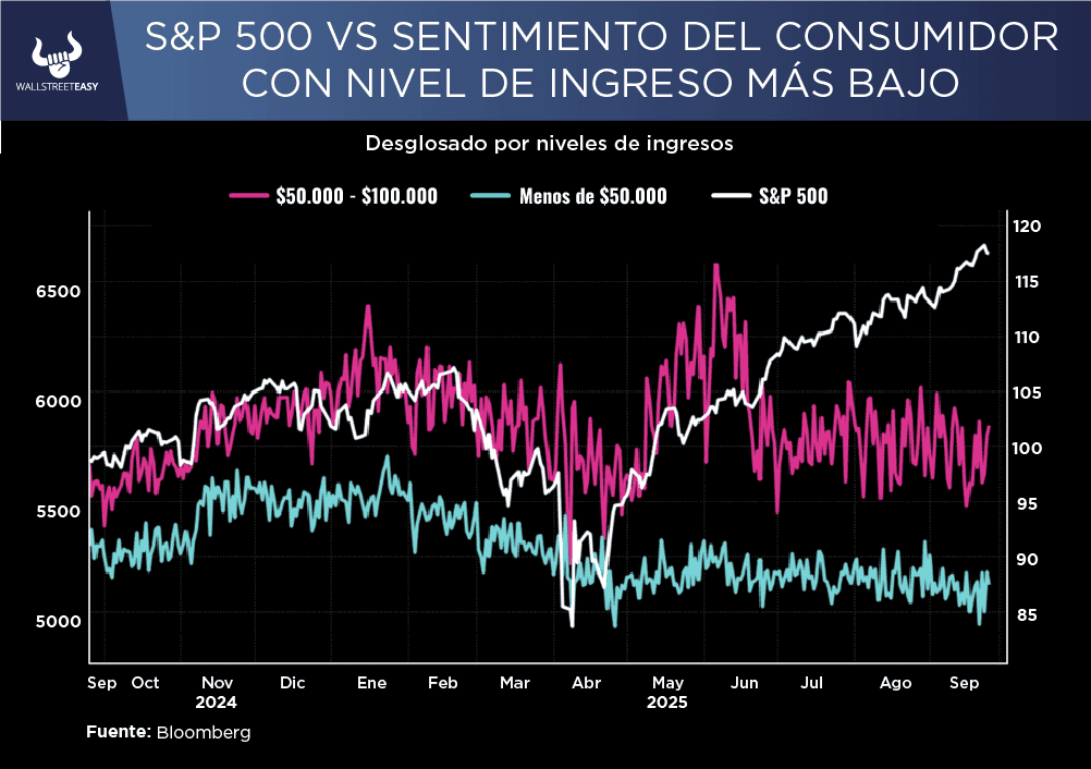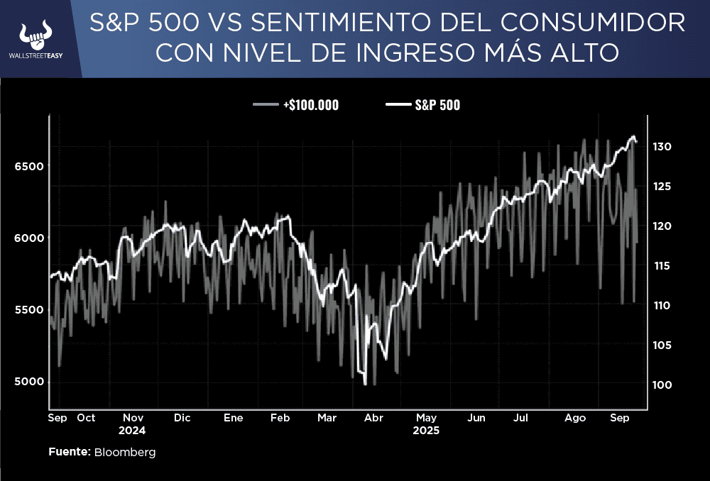 Esta polarización es la clave para explicar la resiliencia económica. Para el segmento más adinerado, con el mayor poder de gasto, su sentimiento tiene una alta correlación con el mercado bursátil. Al comparar la confianza del segmento más rico con el rendimiento del S&P 500, se observa claramente que el auge de las acciones a niveles récord genera un poderoso efecto riqueza. El incremento en el valor de sus activos financieros aumenta su percepción de bienestar y su propensión a consumir, lo que se traduce en un gasto sostenido en la economía.