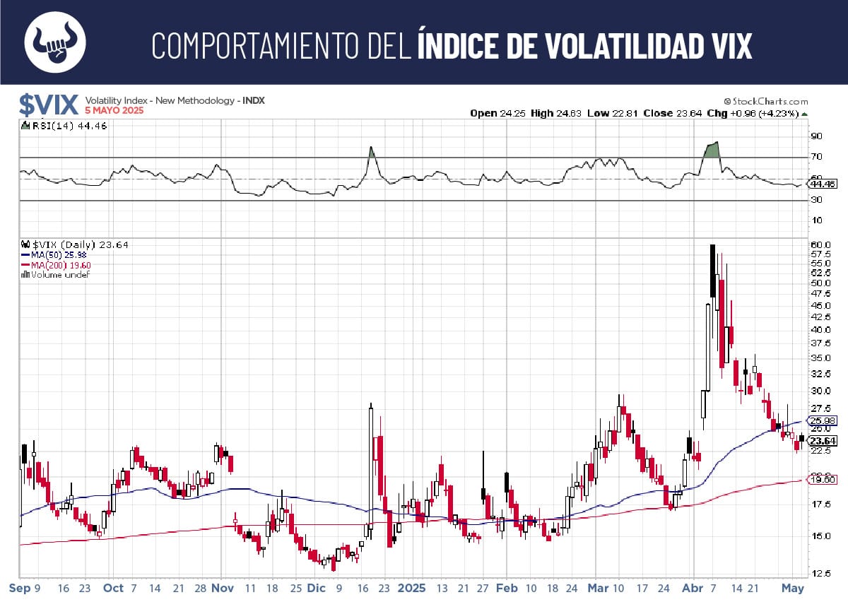 Mientras tanto, el índice VIX muestra señales de descenso, luego de un periodo de considerables ganancias, lo que sugiere una posible reducción en la volatilidad.