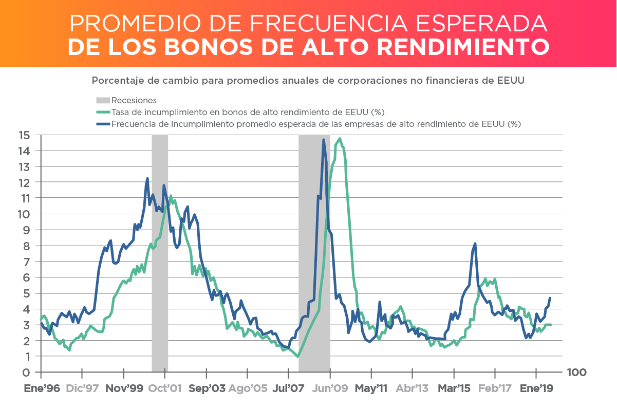 El promedio de un mes para la métrica de frecuencia predeterminada (EDF, por sus siglas en inglés) de los emisores de alto rendimiento de EEUU y Canadá, aumentó del 2,38% en agosto de 2018, y del 4,16% de julio de 2019, a 4,59% en agosto de este año. Su ascenso se unió a una ampliación del promedio de un mes del diferencial de bonos de alto rendimiento desde los 354 puntos básicos (pb) de agosto de 2018 y los 422 pb de julio, a los 468 pb de agosto.