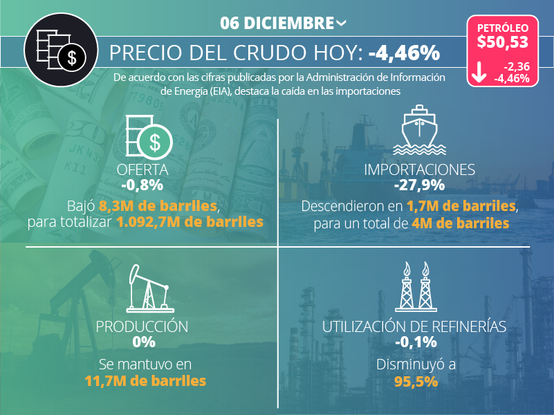 - Al cierre de esta edición, el precio del barril bajó hasta $50,53, lo que representa –5,1% en comparación con el día miércoles.