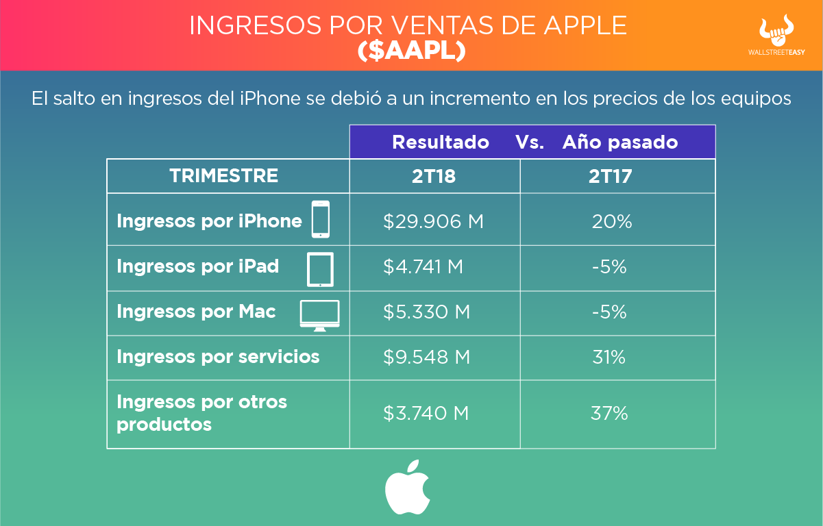 Los resultados superaron las expectativas de Wall Street, ya que la cifra sobrepasó los $52.300M que habían anticipado los expertos. Por su parte, los accionistas de Apple ganaron $2,34 por título, un importe superior a los $2,18 que habían proyectado los analistas y los $1,67 de hace 12 meses.
