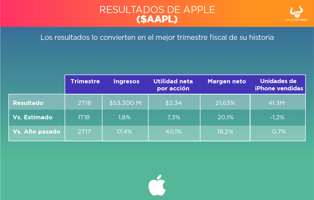Apple (AAPL) dio a conocer los resultados financieros del tercer trimestre de su año fiscal 2018. A pesar de ser un período regularmente bajo, obtuvo números que lo convierten en el mejor tercer trimestre fiscal en la historia de la compañía, con ingresos de $53.300M, un incremento de +17% en relación con el mismo trimestre del año pasado.