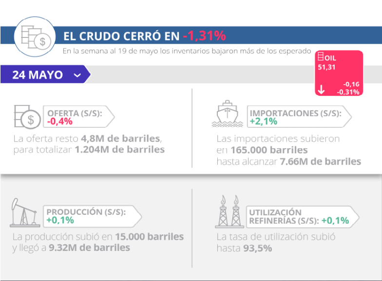 - El miércoles el precio avanzaba a $51,54, con la algarabía por la extensión del trato OPEPy las noticias sobre menos inventarios dadas por el Instituto Americano del Petróleo (API). Luego, el mercado retrocedió a $51,31, ahorrando fuerzas para la reunión de mañana.
