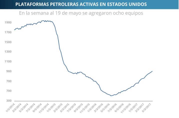En la semana al 19 de mayo la firma de servicios Baker Hughes reportó que se agregaron ocho equipos a la actividad petrolera en EEUU.