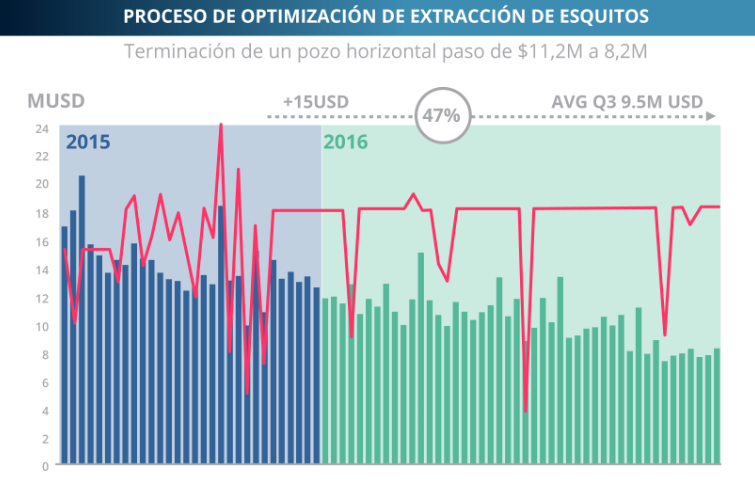 YPF ha reducido la cantidad de recursos monetarios necesarios para extraer el crudo no convencional. El costo promedio de perforación y terminación de un pozo horizontal en Vaca Muerta fue de $11.2M en 2015 (en Eagle Ford, EEUU, es de $6.5M a $7.8M). La empresa dijo que ahora está gastando $8.2M.