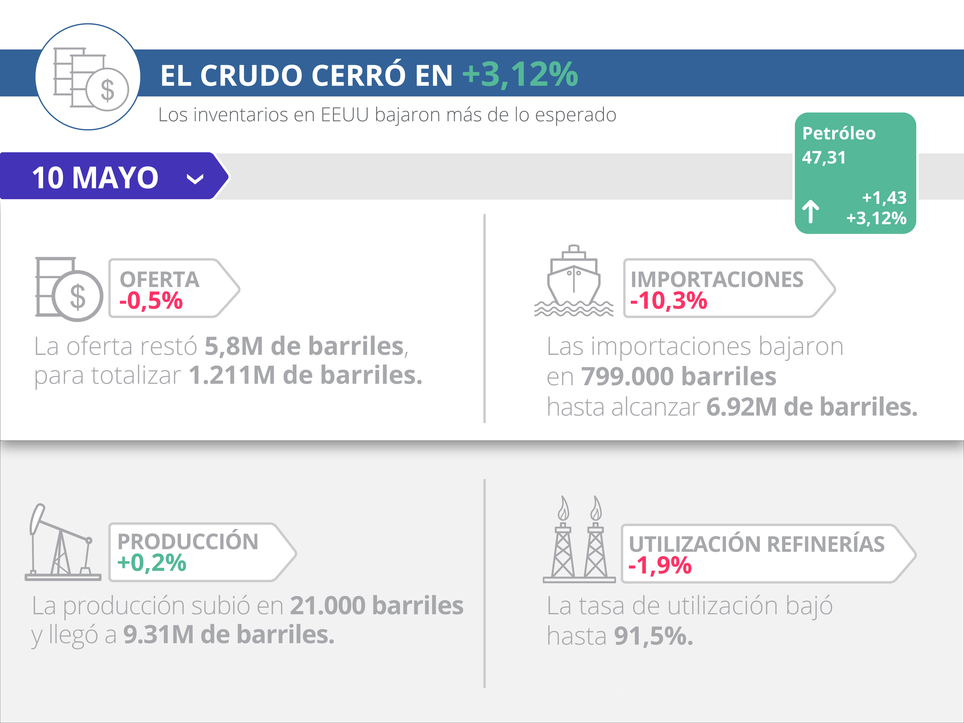La Administración de Información de Energía (EIA, por sus siglas en inglés) reportó una caída de los inventarios en 5.8M de barriles, cifra que coincide con la del Instituto Americano del Petróleo (API, por sus siglas en inglés) y se aleja de la que esperaba el mercado, una merma de 1.8M de barriles. Estos son otros datos relevantes: