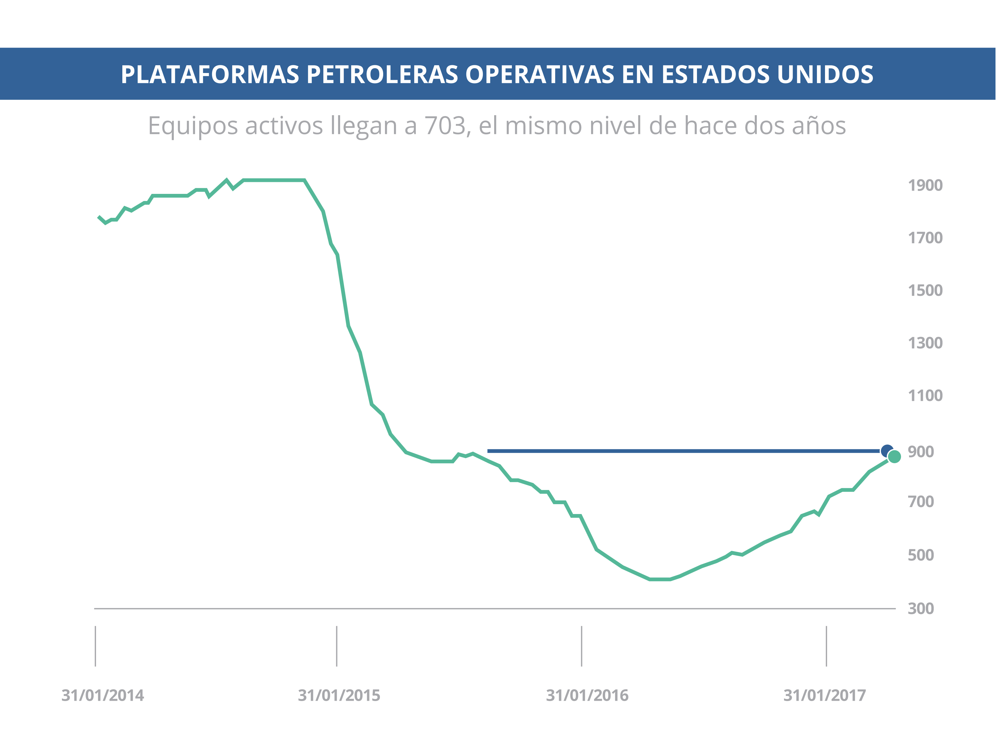 El número de yacimientos activos en ese país subió hasta un total de 703, el mismo nivel del 24 de abril de 2015. Para ese año el precio promedió $48,86.