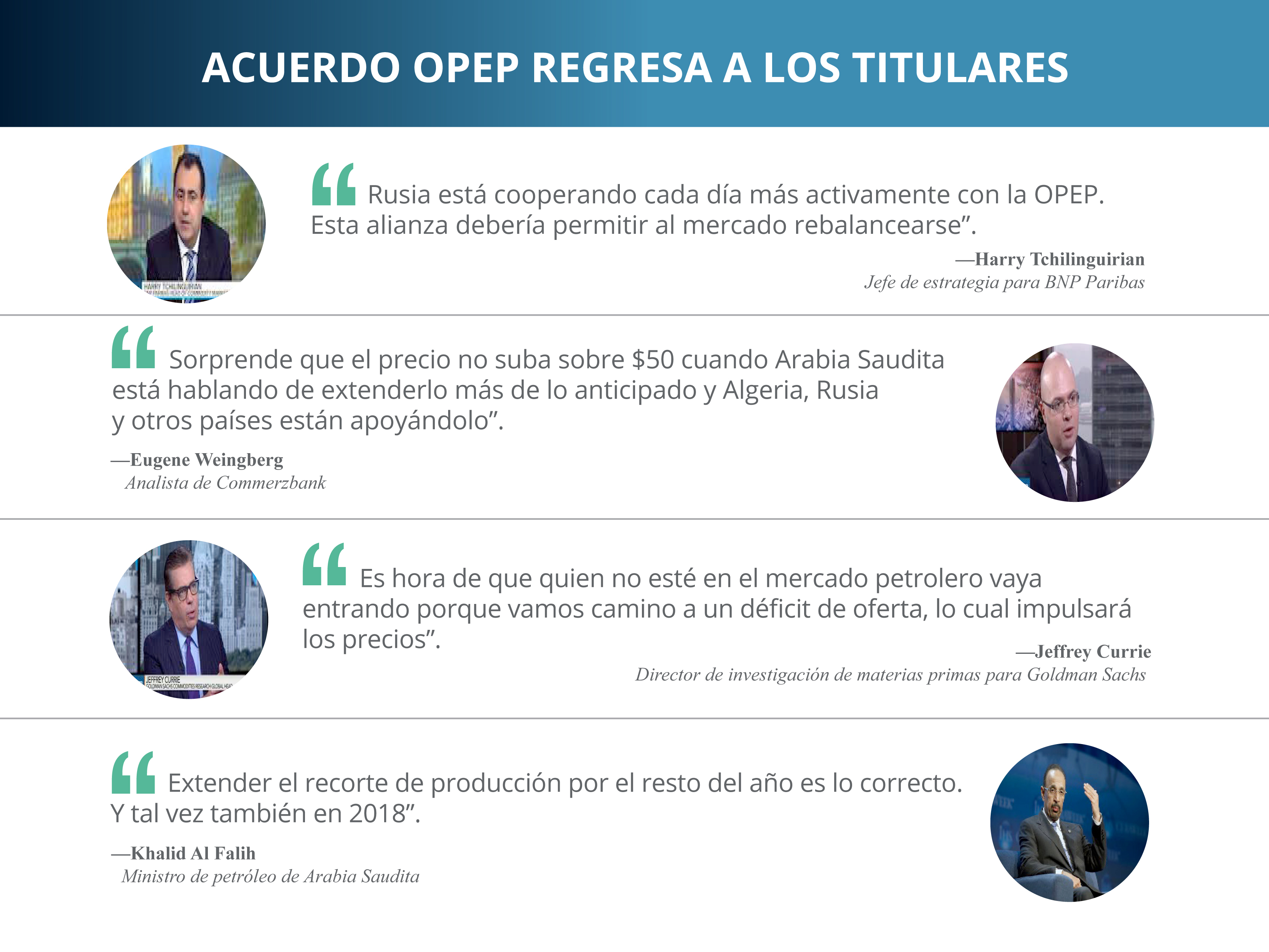 El ministro de Energía de Arabia Saudita, Khalid al-Falih, señaló que los productores «harían lo que sea necesario» para reequilibrar el mercado. Una muestra del apoyo es que ese reino reducirá en 7M los suministros de petróleo a Asia en junio.