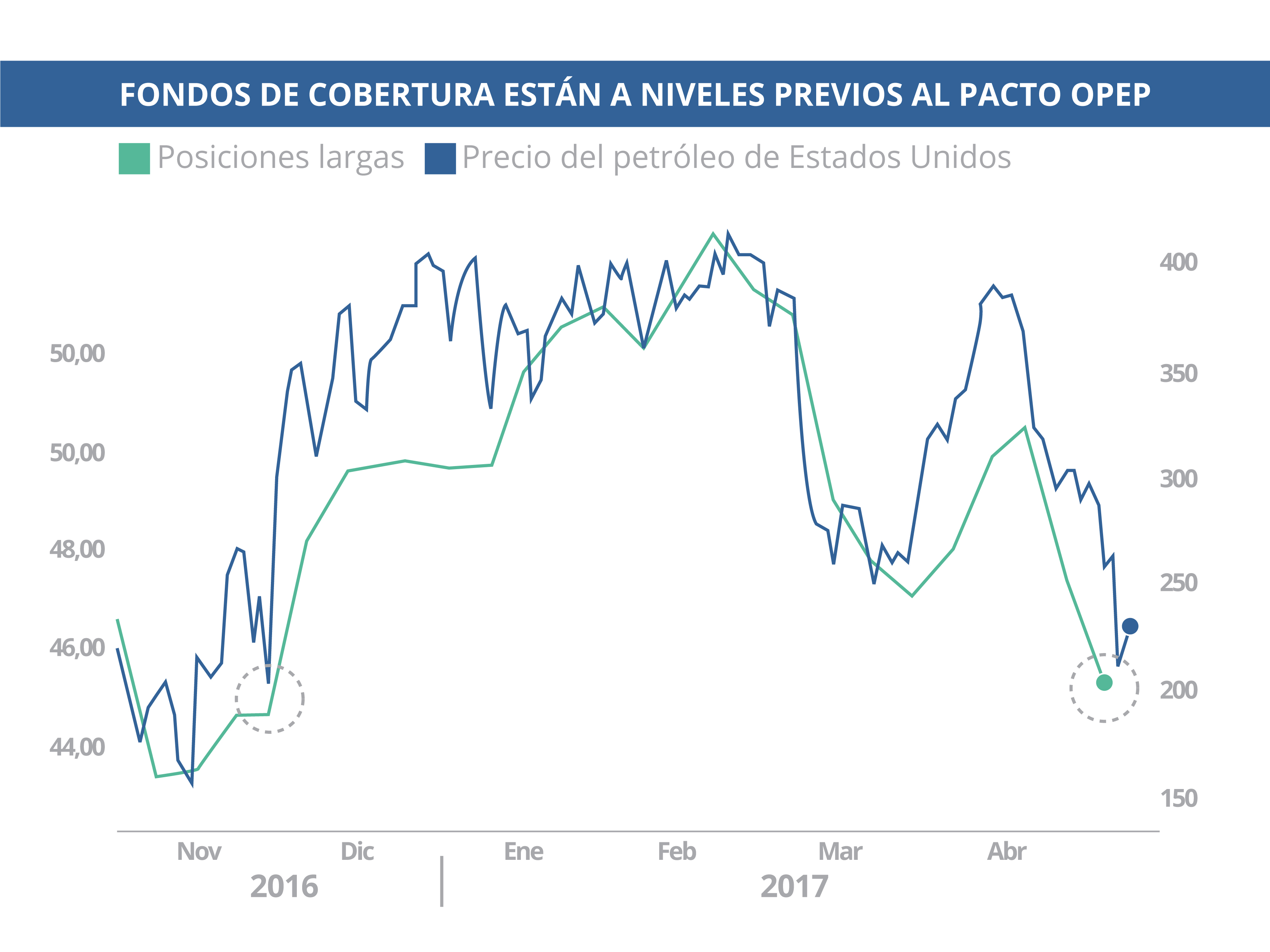 Los fondos de cobertura redujeron su posición larga neta en un total de 236M de barriles entre el 18 de abril y el 2 de mayo y tienen solo tres posiciones largas por cada posición corta, por debajo de una proporción de casi 6:1, el 18 de abril, y una reciente, alta, de 10:1, el 21 de febrero.