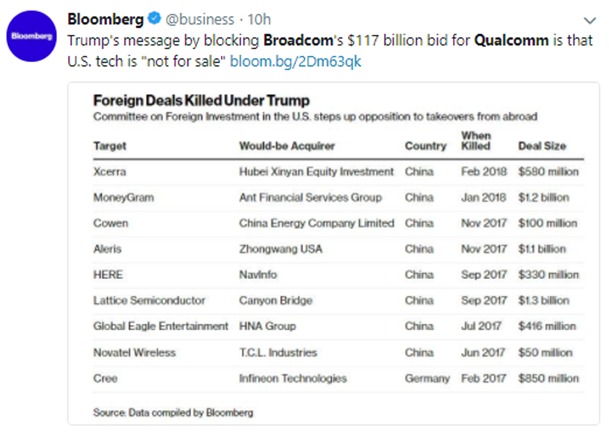 El lunes 12 de marzo, el presidente de Estados Unidos, Donald Trump, emitió una orden ejecutiva para impedir que Broadcom Corporation, una de las principales empresas de semiconductores a nivel mundial, adquiriera a su rival estadounidense, Qualcomm, por considerar que la compra supondría una amenaza para la seguridad nacional del país.