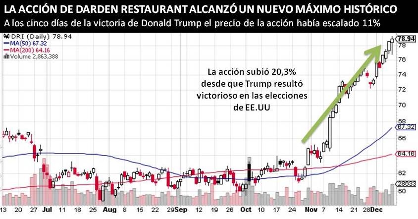 El martes 20 de diciembre, la empresa de servicios de restaurantes Darden Restaurants (DRI) publicará su informe de 2T fiscal de 2017 luego de que la acción celebrara la victoria de Trump con una subida de 20,3%.