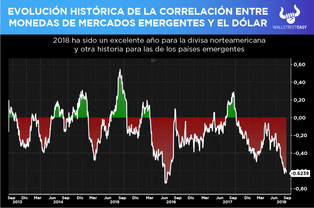 Y la guinda del helado es el dólar, cuya fortaleza debilita cada vez más las monedas emergentes. De hecho, la correlación inversa entre estas divisas se encuentra ahora en su punto más alto en dos años, lo que afecta a los países con más deudas para pagar en moneda extranjera (Turquía y Argentina son los más afectados). Mientras mayor sea esta correlación, caerán más las monedas emergentes cuando el dólar suba.