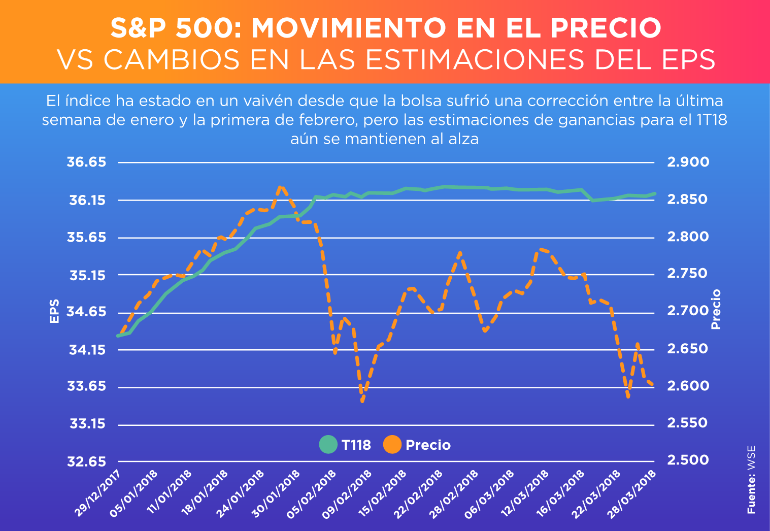 Aunque la mayor parte de las revisiones al alza de las ganancias se dieron en enero, antes de la caída de febrero, las estimaciones permanecieron sin muchos cambios luego de la caída. Esta la primera vez, desde el segundo trimestre de 2010, que se genera un aumento en las proyecciones de EPS para el trimestre con el índice en caída.