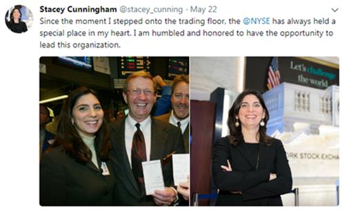 Desde su fundación hace más de 200 años, la Bolsa de Valores de Nueva York, NYSE, por primera vez será presidida por una mujer: Stacey Cunningham, quien, a partir del próximo viernes 25 de mayo, sustituye oficialmente al actual presidente Tom Farley.