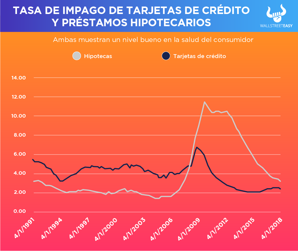 Si observamos las tasas de morosidad sobre préstamos hipotecarios y tarjetas de créditos, vemos que siguen en niveles históricamente bajos, gracias a un consumidor que, al estar saludable, sigue teniendo la capacidad de pagar sus deudas, lo cual siempre es una buena señal. Después de la crisis financiera de 2008, las tasas de impago han venido disminuyendo paulatinamente, con las de morosidad de las tarjetas de crédito cerca de su mínimo histórico y las hipotecarias ubicándose en su punto más bajo desde 2008.