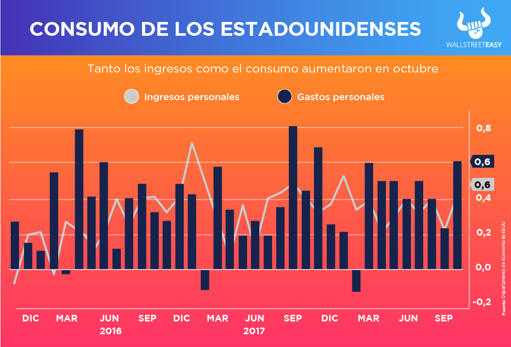 Por su parte, el gasto de consumo, que corresponde a alrededor de 2/3 del PIB, se incrementó +0,6% para octubre, la mayor subida en siete meses, mientras que los ingresos subieron +0,5%, los más elevados desde enero de este año.