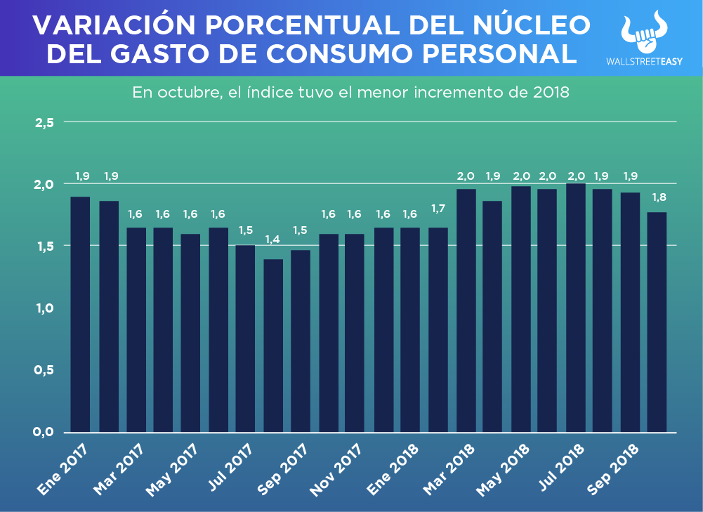 El Núcleo del Gasto de Consumo Personal, indicador de inflación rastreado por la Reserva Federal, que muestra una medida de los precios pagados por las personas para compras domésticas de bienes y servicios, excluyendo los precios de los alimentos y energía, se ha mantenido estable y moderado en los últimos meses, y en octubre registró su menor incremento anual desde febrero al subir +1,8%.
