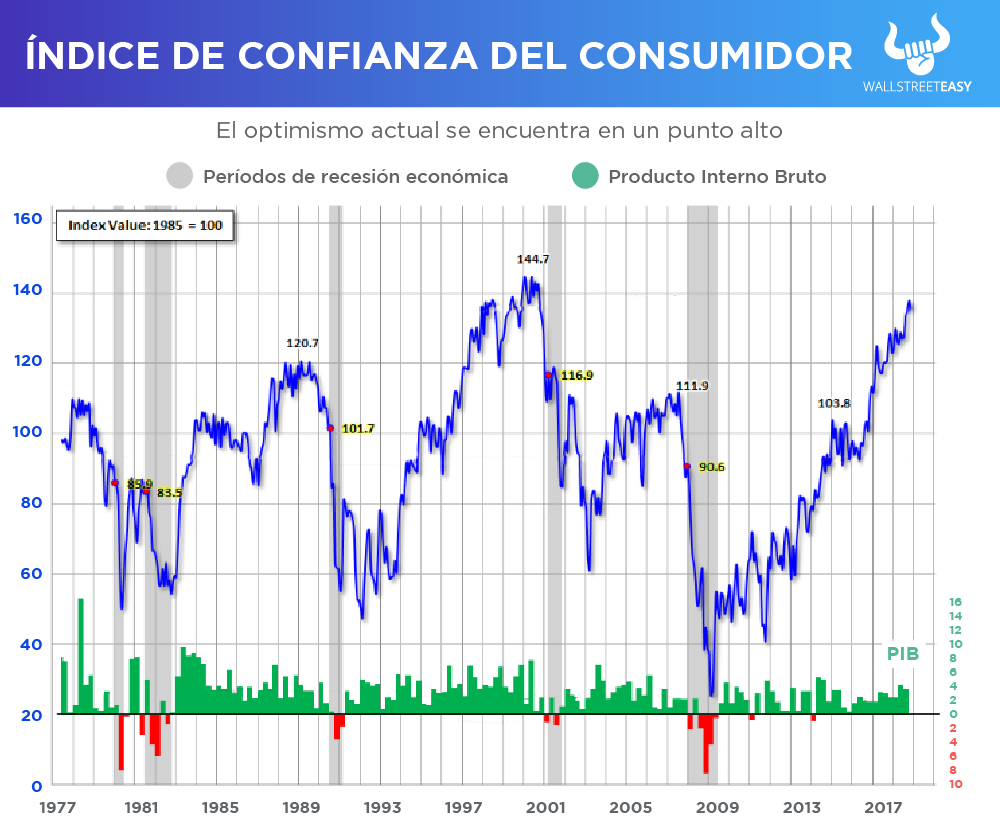 Iniciaremos el análisis con el Índice de Confianza del Consumidor del Conference Board, que consiste en una encuesta realizada a, aproximadamente, 5.000 hogares de EEUU, para medir las perspectivas de los consumidores en relación con las condiciones comerciales actuales y a futuro; es una herramienta confiable de medición de la economía desde su creación en 1967. Actualmente, el optimismo se encuentra en niveles no vistos desde el año 2000.