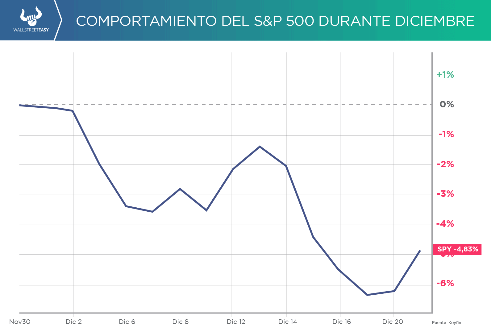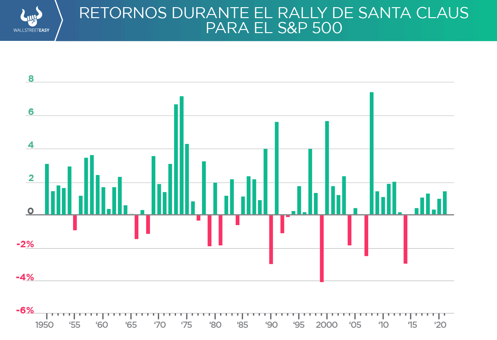 ESPERA, RETROCEDE El Rally de Santa Claus es un aumento sostenido en el mercado de valores que se produce en la última semana de diciembre hasta los dos primeros días de enero. Existen numerosas explicaciones sobre las causas, desde consideraciones fiscales hasta el sentimiento general de optimismo en Wall Street. DAME CONTEXTO Otra teoría afirma que algunos grandes inversionistas tienden a irse de vacaciones, dejando el mercado a inversores menores, que tienden a ser más optimistas. A pesar de un diciembre negativo hasta los momentos (-4,63%) para los mercados, todavía existe la posibilidad de que se dé el rally de Santa Claus en lo que queda de mes, si la historia sirve de guía.